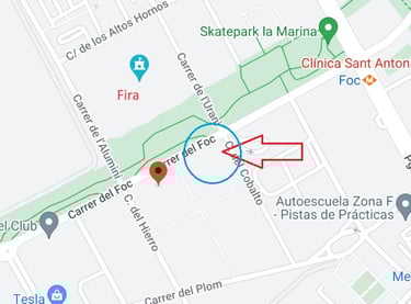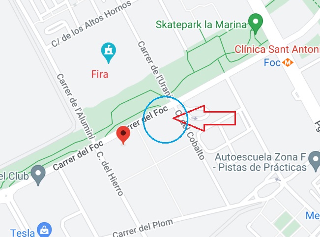 Esta situada en Carrer del Foc 30, esquina con Carrer Cobalt, en el Prat Vermell, frente a la Fira.