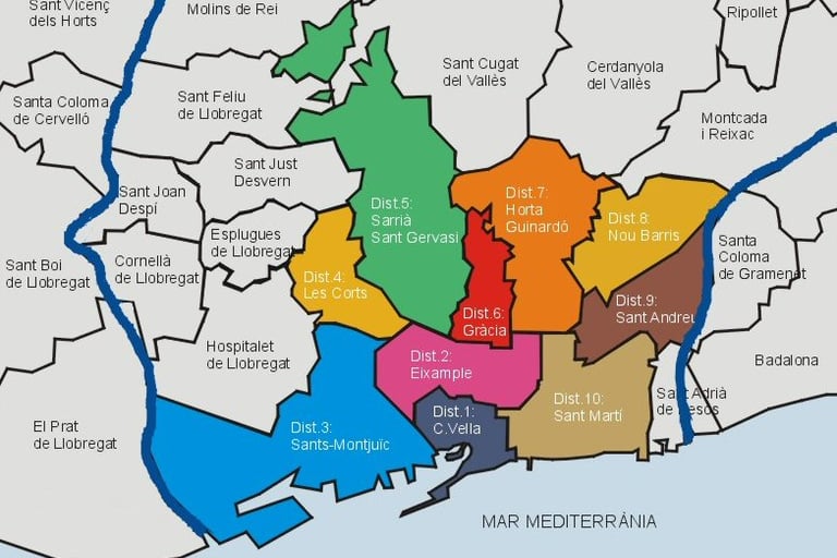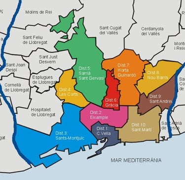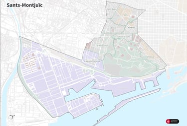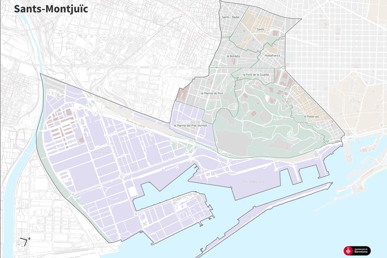 Sants-Montjuïc está formado por ocho barrios: el Poble-sec, Hostafrancs, la Bordeta, la Font de la Guatlla, la Marina de Port, la Marina del Prat Vermell, Sants y Sants-Badal