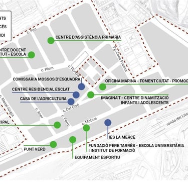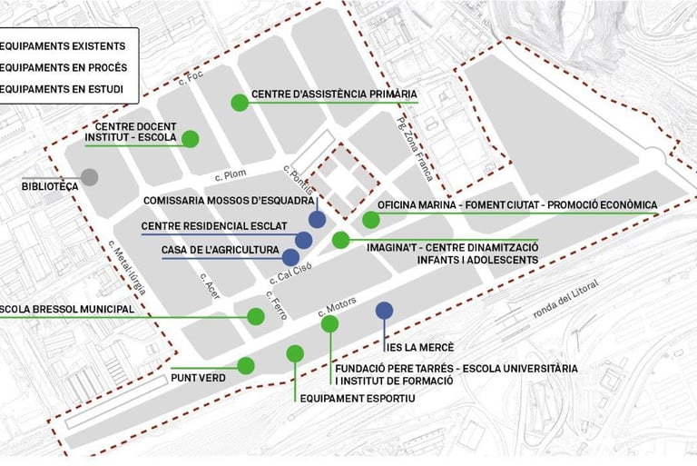 Actualmente están en funcionamiento el IES Mare de Déu de la Mercè, el Centro Residencial Esclat, la Casa de la Pagesia y una comisaría de los Mossos d’Esquadra. A estos equipamientos se sumará una escola bressol municipal, con una capacidad para entre 100 y 150 niños y niñas, un centro de asistencia primaria, un instituto escuela, un centro de dinamización de niños y niñas y adolescentes y una oficina de promoción económica.